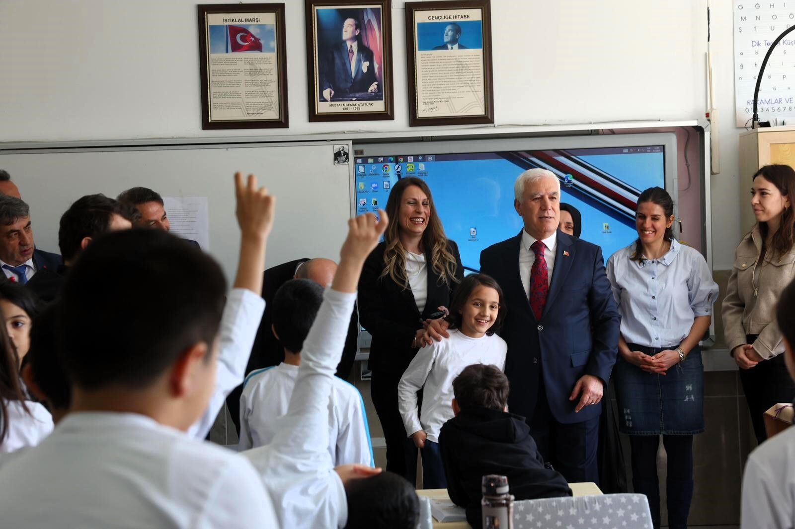 Bursa Büyükşehir Belediye Başkanı Mustafa Bozbey de minik öğrencinin davetini geri çevirmeyerek okulu ziyaret etti. Öğrencilerle sohbet eden Bozbey, çocukların heyecanına ortak olurken eğitimin önemine de dikkat çekti.