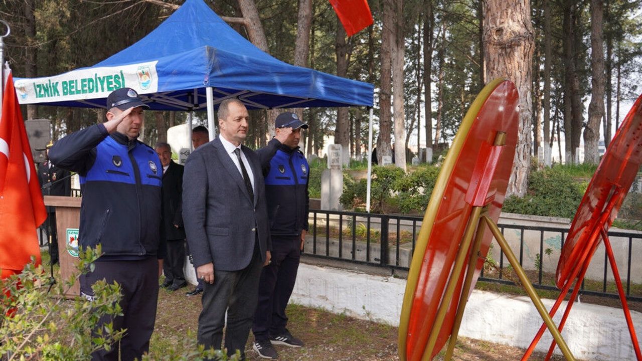 İznik’te 18 Mart Şehitler Günü dolayısıyla ilk tören İlçe Şehitliği’nde yapıldı. Tören, Kaymakam Arif Karaman ve Belediye Başkanı Kağan Mehmet Usta’nın çelenk sunumuyla başladı. Saygı duruşu ve İstiklal Marşı’nın ardından günün anlam ve önemine dair konuşmalar gerçekleştirildi. Program kapsamında Şehitlik Özel Defteri imzalanırken, Kur’an-ı Kerim tilaveti ve dualarla tören sona erdi.